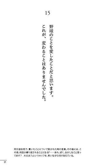 引退会見で、引退の決断に後悔や思い残しはないかと聞かれ、「(前略)後悔などあろうはずがありません」という言葉の後にこう語ったイチロー氏。多くの人がこの言葉について考えさせられたように、彼の言葉にはたくさんのメッセージが詰まっています。これまで同様、“「本人の言葉のみ」を抽出する”ことにこだわり、カバンに入れて持ち運べるサイズ。今一度ぜひ、イチロー氏の足跡とともに、彼の言葉を本書で読み返してみてはいかがでしょうか。